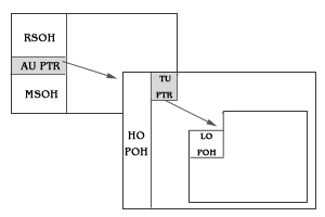 Первая функция указателей является наиболее важной, поскольку именно с ней связано основное преимущество технологии SDH - отсутствие необходимости пошагового мультиплексирования/ демультиплексирования. Указатели административных блоков AD PTR и блоков нагрузки TU PTR обеспечивают прямой доступ к загруженному в синхронный транспортный модуль потоку на любом уровне (рис.4.10). Как видно из рис.4.10, в системах передачи SDH используются два типа указателей - административной (AU-PRT) и трибутарной групп (TU-PTR). Указатели образуются байтами Н, описанными в предыдущем разделе.