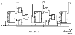 Связи между триггерами реверсивного счётчика соответствуют как суммирующему, так и вычитающему счётчику, но работает только одна из связей, которая определяется командой «Реверс» и подается на элемент И–НЕ, включенные в цепи передачи сигнала переноса. Схема реверсивного счётчика показана на Рис 1.14.16.