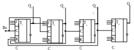 Каждый из универсальных триггеров может переключаться при подаче на вход С положительного («одиночного») импульса либо при подаче сигнала на вход С с выхода другого триггера. При этом переключение последующего триггера происходит тогда, когда предыдущий переключается из «1» в «0». Учитывая это, находим необходимое место подключения входов С всех четырех триггеров. Первый триггер должен переключаться при подаче первого, пятого и нулевого (десятого) импульса. Ни один из последующих триггеров не может обеспечить всех трех переключений. Поэтому на вход С первого триггер нужно подавать счетные импульсы. Они обеспечивают максимальную частоту переключений, а выборка нужных моментов переключения обеспечивается подачей сигналов на вход J и K .