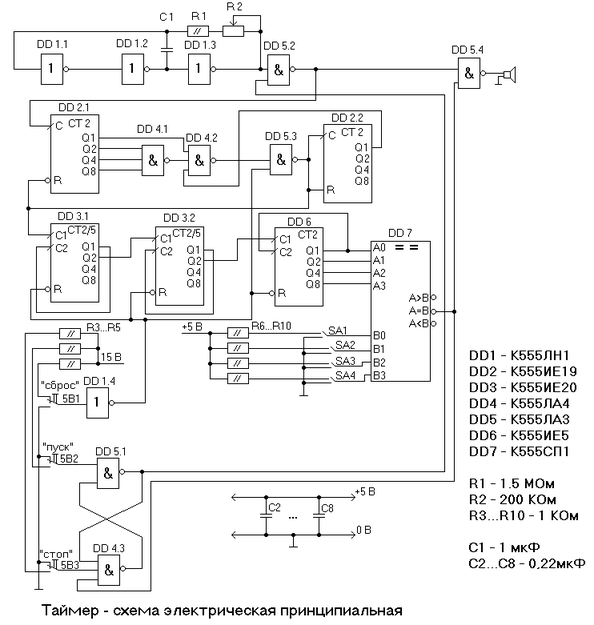 Микросхема К555СП1 позволяет сравнивать без приращения разрядности 4-х разрядные двоичные коды. Так как в задании не оговорен предел измерений таймера, то мы можем ограничиться пределом 16 секунд.