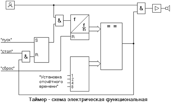 Функциональная и принципиальная схемы таймера представлены ниже: