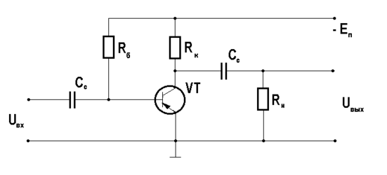 Схема включения транзистора с общим эмиттером, с фиксированным током базы, с резистивно- ёмкостной связью с нагрузкой.
