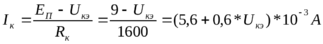 при Iк= 0, Uкэ= Еп = 9 В, и при Uкэ= 0, Iк= Еп / Rк = 9 / 1600 = 5,6 мА