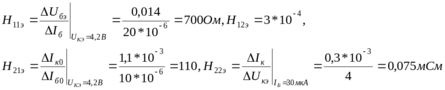 ΔIк0= 1,1 мА, ΔIб0 = 10 мкА, ΔUбэ = 0,014 В, ΔIб = 20 мкА, ΔUкэ= 4 В, ΔIк= 0,3 мА