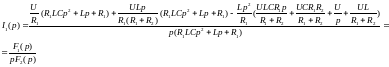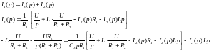 2) Находится изображение искомого тока. Операторная схема замещения содержит 3 источника в разных ветвях: основной и два дополнительных. Поэтому для нахождения изображения тока второй ветви воспользуемся законами Кирхгофа в операторной форме: