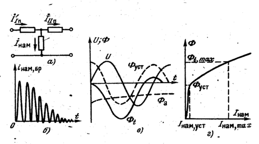 а — поясняющая схема; б —изменение тока намагничивания; в — изменения напряжения и магнитного потока; г — характеристика намагничивания.