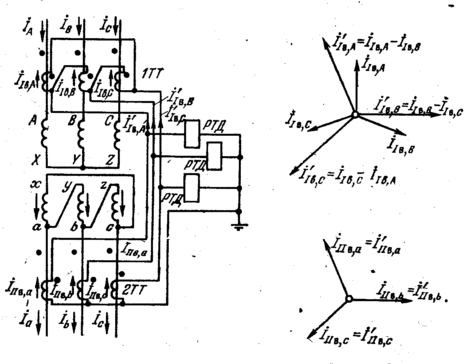 Рис. 5. Схема соединения ТТ дифференциальной токовой защиты трансформатора Y/-11 и векторные диаграммы.