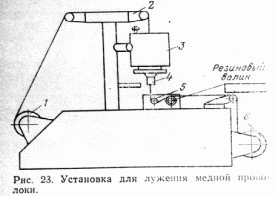 Двигатель приводит в движение механизм протяжки провода. Регулировка скорости лужения производится автотрансформатором. Во избежании растворения провода в припое и обрыва остановка движения провода не допускается. Внутренний диаметр формирующей фильеры, изготовленной из титанового сплава, равен окончательному диаметру облуженой проволоки с учетом необходимого наращенного слоя. Попадая в фильеру, припой по мере прохождения по длине формирующего канала вместе с проводом охлаждается и затвердевает. Режим лужения, обеспечивающий получения на проводнике слоя припоя заданной толщины без наплывов и утолщений подбирается регулированием скорости движения проволоки через фильеру и расходом воздуха через воздухопровод, охлаждающий фильеру и провод.