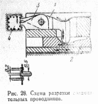 На (рис.28) показана схема разрезки микромодульных соединительных проводников. При движении подвижных ножей 1 копир 2 вперед происходит разрезка, а отходы остаются между неподвижными ножами 3. При движении назад происходит выталкивание отходов.
