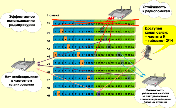 Любое из портативных устройств стандарта DECT в принципе имеет доступ к любому каналу (как к частотному, так и к временному). Когда необходимо установить соединение, портативное устройство связи DECT выбирает канал, обеспечивающий наиболее качественную связь. После того как соединение установлено, данное устройство продолжает анализировать диапазон, и если обнаруживается канал, гарантирующий лучшее качество связи, то переключает соединение на него.