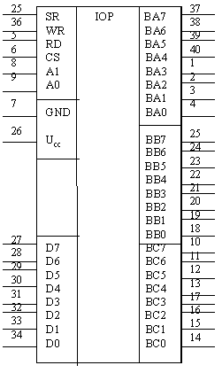Обмен информацией между магистралью данных систем и микросхемой 580ВВ85 осуществляется через 8 разрядный двунаправленный трехстабильный канал данных. Для связи с периферийными устройствами используется 24 линии В/В, сгруппированные в три 8 разрядных канала ВА, ВВ, ВС, направление передачи информации и режимы работы которых определяются программным способом.