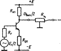 Здесь учтено, что к выходу одного плеча подключается только половина RH. Действительно, средняя точка резистора RH для рассматриваемого режима ДУ всегда будет иметь нулевой потенциал (потенциал общей шины).