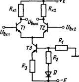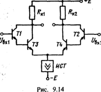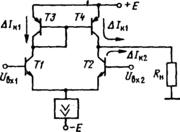 На рис. 16 приведена принципиальная схема одного из вариантов ДУ с динамической нагрузкой. Этот ДУ выполнен на комплементарных транзисторах: п-р-п транзисторах Т1, Т2 и р-п-р транзисторах ТЗ и Т4. Транзисторы Т1 и Т2 выполняют свои обычные функции усилительных элементов, а транзисторы ТЗ и Т4 — нагрузочных элементов, т. е. резисторов. Транзистор ТЗ включен по схеме диода. Предположим, что на базу у транзистора Т1 приложена в рассматриваемый момент положительная полуволна Uвх1. В результате в цепи транзистора ТЗ возникает приращение тока ∆Iк1 протекающего в направлении, указанном стрелкой на рис. 16. За счет этого тока возникает приращение напряжения между базой и эмиттером ТЗ, которое является приращением входного напряжения для транзистора Т4. Таким образом в цепи эмиттер—коллектор Т4 возникает приращение тока, практически равное ∆Iк1, поскольку в ДУ плечи симметричны. Структуру, основой которой являются транзисторы ТЗ и Т4, принято называть отражателем тока, или токовым зеркалом. Отражатели тока находят широкое применение в современных ИС непрерывного действия.
