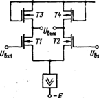 Коэффициент усиления по напряжению для дифференциального сигнала определяется отношением ширин каналов МДП-транзисторов рис. 16 Т1 и ТЗ (или Т2 и Т4). Технологически это отношение сделать большим очень трудно, поэтому в реальных структурах Ки диф обычно не превышает 10. И КООС у таких ДУ тоже меньше, чем у ДУ на биполярных транзисторах. Однако входные сопротивления велики как для дифференциального, так и для синфазного сигналов (более 1010 Ом). В ДУ на МДП-транзисторах обычно Rвх пл определяется утечками структуры. Для получения ДУ с очень большими входными сопротивлениями и с хорошими другими параметрами целесообразно использовать усилитель рис. 14, в котором транзисторы Т1 и Т2 являются МДП-транзисторами.