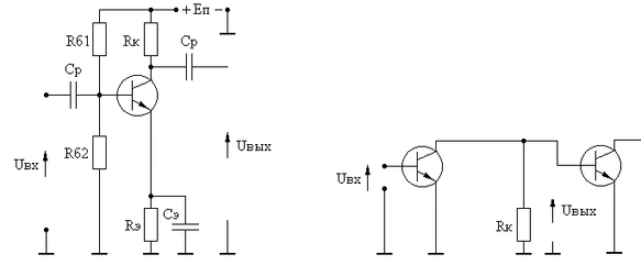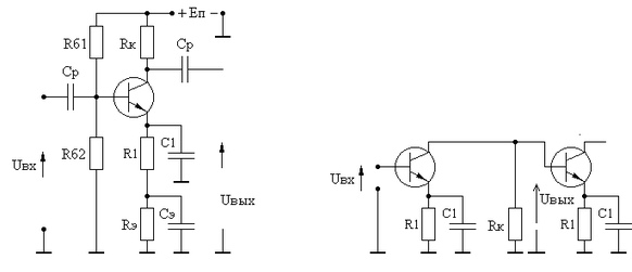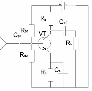 - элементы коррекции. При отсутствии реактивности нагрузки эмиттерная коррекция вводится для коррекции искажений АЧХ вносимых транзистором, увеличивая амплитуду сигнала на переходе база-эмиттер, с ростом частоты усиливаемого сигнала.