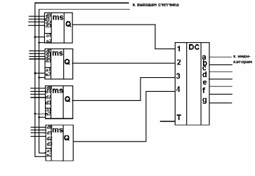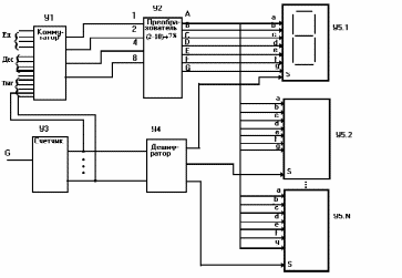 Счетчик Y3 непрерывно подсчитывает входные импульсы, подаваемые от генератора G. Коэффициент пересчета счетчика N=4. Каждое состояние счетчика Y3 дешифрируется дешифратором Y4, подключая соответствующий индикатор. n=4.i=3.Цифра 7