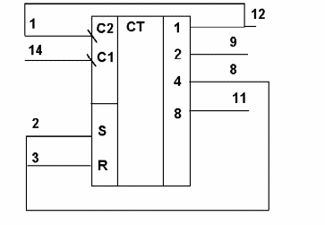 Для обеспечения N=n=4 необходимо, чтобы при появлении на выводе двоичного кода 0111(2) = 7(10) все триггеры счетчика сбрасываются в 0. Для этого необходимо ввести цепи ОС с выходов счетчика, на соответствующие входы. Для данного случая необходимо вывод 8 счетчика соеденить со схемой “сброс” (выводы 2,3). Тогда при появлении на выходе кода 0111 “ еденица “ с выхода 8 сбросит счетчик в исходное состояние.