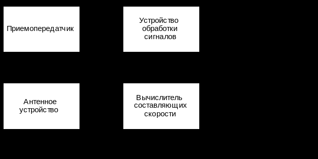 состав измерителя вектора скорости, упрощенная структурная схема которого представлена на рисунке, входят антенное устройство, формирующее три или четыре луча, приемопередатчик, устройство обработки сигналов, вычислитель составляющих скорости и устройство отображения. Обычно данные ДИСС непосредственно вводятся в систему автоматического управления ЛА.