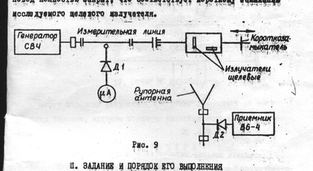 - подключить к генератору согласно схеме (рис.9) волновод с продольной и поперечной щелями. Переместить пластины со щелями так, чтобы середина поперечной щели оказалась симметричной оси волновода. Направить максимум излучения на приемную рупорную антенну. Зафиксировать наличие излучения с помощью приемника. Короткозамыкателем настроить щелевой излучатель на максимум излучения.