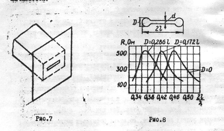 В тех случаях, когда излучатель должен быть более широкополосным, находят применение гантельные щели. Зависимость входного сопротивления гантельной щели от ее размеров приведена на рис.8. С увеличением диаметра закругления D точка резонанса смещается в сторону больших длин волн и полоса пропускания увеличивается.