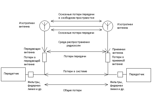 L(R) - потери на трассе распространения сигналов от РИД (в данном случае источника радиопомех) к РПМ (рецептору радиопомех), дБ. Эти потери принято называть основными потерями передачи, которые рассчитываются от входа передающей изотропной антенны до выхода приемной изотропной антенны. На рис. 13 показана структура линии радиосвязи и основные термины, используемые для представления о потерях передачи.