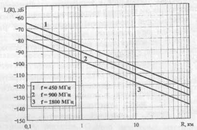 На рис. 14 показана зависимость ослабление радиоволн от расстояния в свободном пространстве для трех диапазонов частот. Наклон данной характеристики составляет 20 дБ на декаду. Модели ослабления радиоволн в приземном слое, соответствующие условиям сухопутной подвижной связи, будут иметь более сложную зависимость и более высокий показатель ослабления, а значит и более крутой спад характеристики ослабления по сравнению с приведенной на рис. 14.