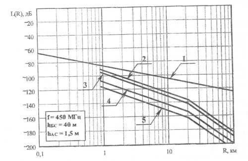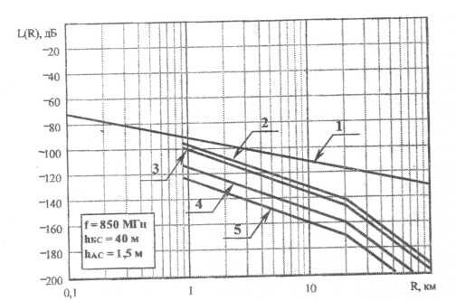 На рис. 15, 16 представлены графики для медианного значения ослабления радиоволн по модели Hata и свободного пространства в диапазонах 450 МГц и 850 МГц. Значения параметров hБС, hАС, указаны на рисунках. Цифрами обозначены: 1 - свободное пространство; 2 - открытая местность; 3 - пригород; 4 - город; 5 - большой город.