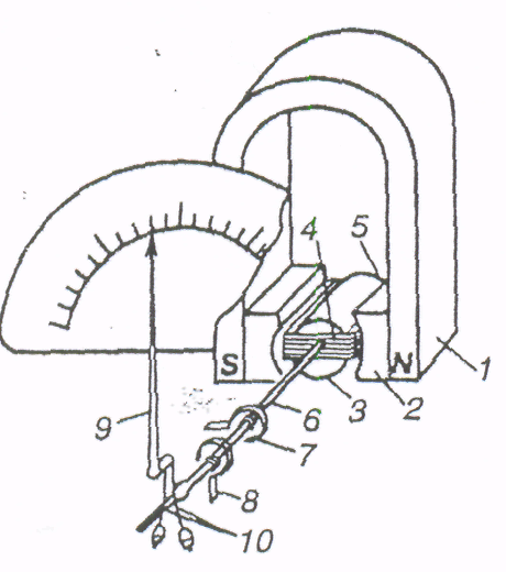 В зазоре между полюсными наконечниками и сердечником создается сильное равномерное радиальное магнитное поле, в котором находится подвижная прямоугольная катушка 4, намотанная медным или алюминиевым проводом на алюминиевом каркасе (применяют и бескаркасные рамки). Катушка (рамка) может поворачиваться в зазоре на полуосях 5 и 6. Спиральные пружины 7 и 8 создают противодействующий момент и используются для подачи измеряемого тока от выходных зажимов прибора в рамку (механические и электрические соединения на рисунке не показаны). Рамка жестко соединена и со стрелкой 9. Для балансировки подвижной части имеются передвижные грузики 10. Проходя по проводникам обмотки рамки, ток взаимодействует с магнитным потоком постоянного магнита, что вызывает появление механических сил F, создающих вращающий момент Мвр, стремящийся повернуть рамку.