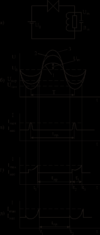 Рис.4. Эквивалентная схема генератора на диоде Ганна (а) и временные зависимости напряжения (б) и тока через диод Ганна в пролетном режиме (в) и в режимах с задержкой (г) и гашением домена (д).