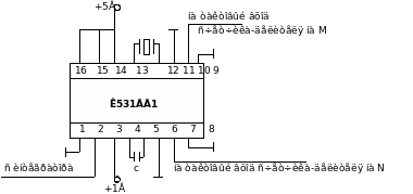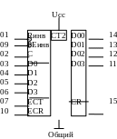 | 1 2 3 4 5 6 7 8 9 10 11 12 13 14 15 16 | R(инв.) С D0 D1 D2 D3 ECT OV PE(инв.) ECR D03 D02 D01 D00 CR Ucc | вход установки в состояние «лог. 0» вход тактовый вход данных вход данных вход данных вход данных вход разрешения счета общий вывод вход разрешения парал. загрузки вход разрешения переноса выход данных выход данных выход данных выход данных выход переноса напряжения питания |