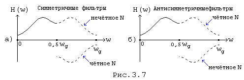 Фильтры с четными импульсными характеристиками называются симметричными, с нечетными - антисимметричными. Каждый из отмеченных типов фильтров имеет свои особенности в зависимости от четности числа отводов N, что удобно рассмотреть на конкретных примерах.