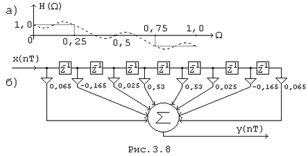 На рис. 3.3, б приведены схема и импульсная характеристика симметричного фильтра для случая N=4. Передаточная функция фильтра