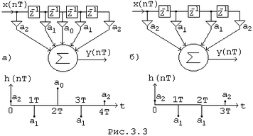 Схема и импульсная характеристика для случая N=4 приведены на рис. 3.5, б. Передаточная функция