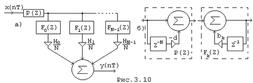 Реализация фильтров по схеме на Рис. 3.10, а сопряжена с некоторыми особенностями, обусловленными комплексным характером коэффициентов в отводах. Поэтому на практике получил распространение еще один вариант схемы такого фильтра, отличающийся вещественным характером коэффициентов.