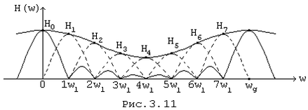 на частоте w = kw1 принимает значение частотной выборки H(jkw1); остальные отсчетные функции на этой частоте обращаются в нуль. На графике Рис. 3.11 показана в качестве примера некоторая АЧХ и ее составляющие - равносмещенные отсчетные функции для случая N=8, где отсчетные функции представлены главным лепестком, кроме модуля отсчетной функции при К=0, которая изображена полностью.