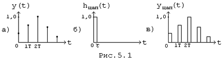 На рис. 5.1, а,в показана форма сигналов на входе и выходе ЦАП на примере импульсной характеристики в форме прямоугольного импульса длительностью t (Рис. 5.1, б)