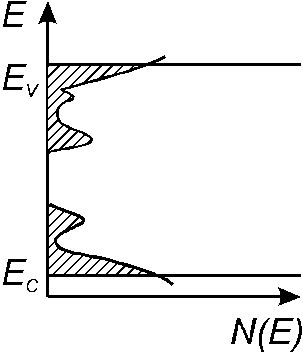 На рис. 1.2 показано одно из возможных распределений плотности состояний. Вместо границ зон проводимости и валентной появляются края подвижности