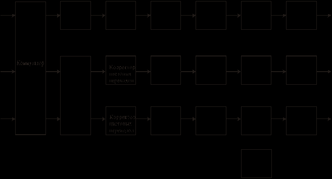 Далее сигналы R-Yи B-Y идут раздельно каждый по своему каналу. Каналы идентичны. В блоках 3, 4 уменьшение фронтов цветоразностных переходов необходимо для повышения четкости цветовых переходов. В блоках 8, 9, 11, 12, 14, 15 происходит сжатие и растяжение изображения. На выходах ЦАП (18, 19) сигналы уже имеют аналоговую форму.