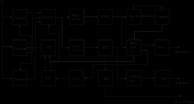 Сигнал ПЧ с выхода смесителя поступает на фильтр на поверхностно-аккустических волнах (ПАВ). Параметры фильтра определяют амплитудно-частотную характеристику УПЧ, а значит избирательность по соседнему каналу и равномерность передачи спектра ТВ сигнала в полосе пропускания. Затем сигнал усиливается в УПЧ и поступает на видеодетектор. Он выполнен по схеме синхронного детектора, основное достоинство которого – малые нелинейные искажения при детектировании слабых сигналов.