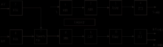 Сигналы яркости и цветности в двоичном коде проходят коммутатор (1), далее каждый из сигналов Y, B-Y, R-Y идет по своему каналу.