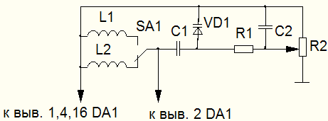 Желаемый диапазон выбирается переключателем SA1, коммутирующим катушки L1 и L2. С помощью R2 осуществляется настройка на заданную радиостанцию. При перемещении движка резистора R2 изменяется уровень напряжения на варикапе VD1, тем самым изменяется частота гетеродина Fг. Из формулы: Fпр=Fг – Fс, где Fпр – частота промежуточная, Fс – частота сигнала, видно что при изменении Fг (при Fпр=const) Fc также изменяется, то есть производится настройка на радиостанцию.
