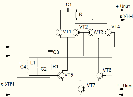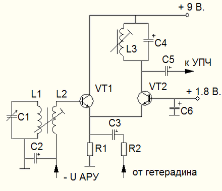Преобразователь частоты, схема которого приведена на рисунке 7, обладает повышенной линейностью для напряжения сигнала примерно в 15 раз. Для переменного тока входного сигнала, транзистор VT1 включён по схеме ОК, а транзистор VT2 – по схеме ОБ. Нелинейность проходной характеристики первого транзистора компенсируется нелинейным входным сопротивлением второго для сигналов с уровнем примерно до 50 мВ. Для переменного напряжения гетеродина оба транзистора включены дифференциально. Максимальный коэффициент преобразования в таком преобразователе получается при балансе дифференциального усилителя, то есть тогда, когда токи коллекторов обоих транзисторов равны. При перераспределении токов между транзисторами в сторону увеличения тока коллектора одного из них, коэффициент передачи уменьшается и при разности напряжений между базами дифференциальной пары около 200 мВ, уменьшается в 1000…2000 раз (60…66 дБ) по сравнению с максимальным. Это обстоятельство позволяет применять такой преобразователь в качестве единственного регулируемого цепью АРУ каскада в приёмнике.