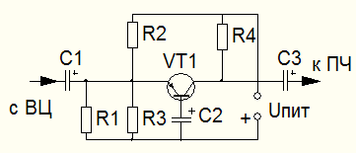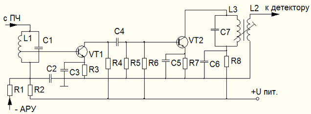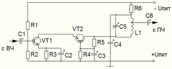 Транзистор VT1 включён по схеме с общим эмиттером, VT2 – с общей базой. Преимуществом такой схемы УРЧ является то, что она применяется во всех диапазонах, включая УКВ.
