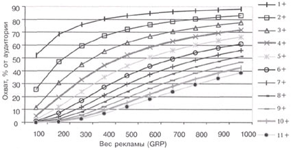 Рассмотрим график роста охвата при возрастании рекламного веса (GRP), подсчитанный на женскую аудиторию (рис. 1). На графике кривая (1 +) отражает количество представителей целевой груп пы, увидевших рекламный ролик 1 и более раз при определенном рекламном весе (GRP), а кривая (2 +) представляет количество зрите лей, увидевших рекламный ролик 2 и более раз и т.д. Кривая (1+) показывает, что в данной аудитории невозможно охватить более 90% всех представителей и, кроме того, это возможно при очень большом весе рекламы (до 1000 GRP).