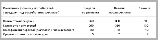 Для этого не обязательно проводить маркетинговые исследования после каждого рекламного объявления, что особенно накладно для небольших компаний. Рассмотрим пример розничного магазина. Для того, чтобы получить такие результаты, все что нужно это дать задачу одному из менеджеров посчитать количество посетителей в определенное время (Таблица 3).