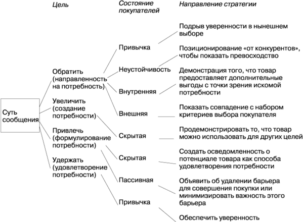 К этим состояниям покупателей относятся: привычка; неустойчивое предпочтение; внутреннее предпочтение (когда что-то нравится) и/или внешнее предпочтение, включающее некоторую комбинацию критериев выбора: технических, экономических, юридических, интегрирующих и адаптивных. Колонка 2 описывает то, как такие состояния и количество покупателей, находящихся в каждом из них, можно измерить. Колонка 3 описывает наиболее подходящую цель (стоит ли обращать, увеличивать, привлекать или сохранять) при условии, что покупатели находятся в определенном состоянии. И наконец, в 4-й колонке предлагается направление рекламной стратегии. Таким образом, если состояние покупателя — это выборочное поведение, то целью может быть обращение его в нашего потребителя, а стратегией — позиционирование товара как противоположности конкурентам, дабы продемонстрировать его конкурентные преимущества.
