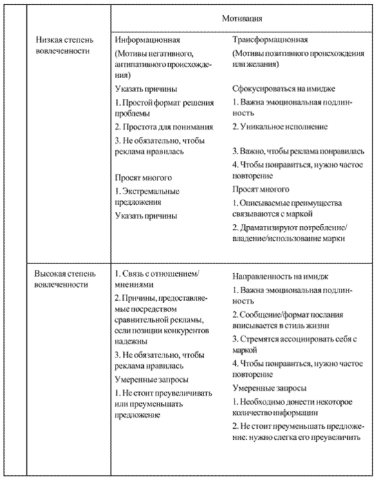 Был предпринят ряд попыток дать общие советы относительно того, как разработать стратегию послания. В табл. .2 содержатся рекомендации, данные Росситером и Перси в их книге о рекламе. Первый шаг в использовании таблицы — это классификация покупателей по характеру принятия решений и мотивации. Особенность принятия решения может заключаться в высокой или низкой степени вовлеченности, а мотивация может быть информационной или трансформационной.