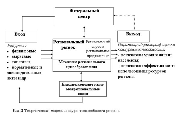 В данном исследовании под моделью конкурентоспособности региона с позиций потенциальной осуществимости мы будем понимать совокупность правовых, экономических, социальных, политических условий, учреждений, инфраструктуры, обеспечивающих расширенное воспроизводство народно-хозяйственного комплекса региона на основе эффективного функционирования механизма ценообразования и использования преимуществ современного регионального рынка. (см. Рис. 2.)