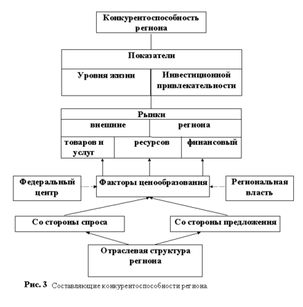 Таким образом, на наш взгляд, в основе конкурентоспособности региона лежат факторы ценообразования, имеющие как определенную специфику для каждого типа регионального рынка, так и тесно связанные между собой.( См. рис.№ 3 )