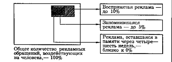 Во-вторых, выборочное удержание. Через четыре-шесть недель вначале запомнившиеся рекламные объявления, как правило, забываются. Количество оставшихся в памяти не превышает половину воспринятых, т. е. составляет не более 5% от общей массы воздействовавшей на человека рекламы.